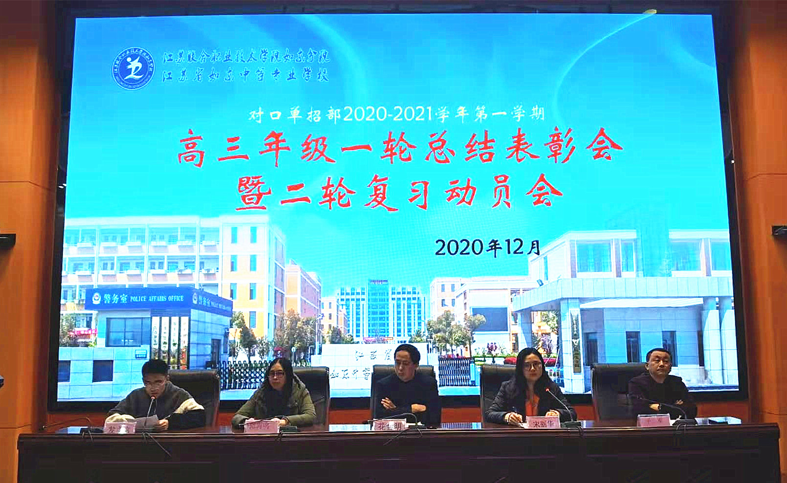 2020年12月2日下午第一课,对口单招部在学校小报告厅召开高三年级一轮总结表彰会暨二轮复习动员会。会议由高三年级主任宋丽华主持,对口单招部花金明主任、教务处陆海鸣副主任、高三年级组长于军、高三年级全体学生和班主任参加。