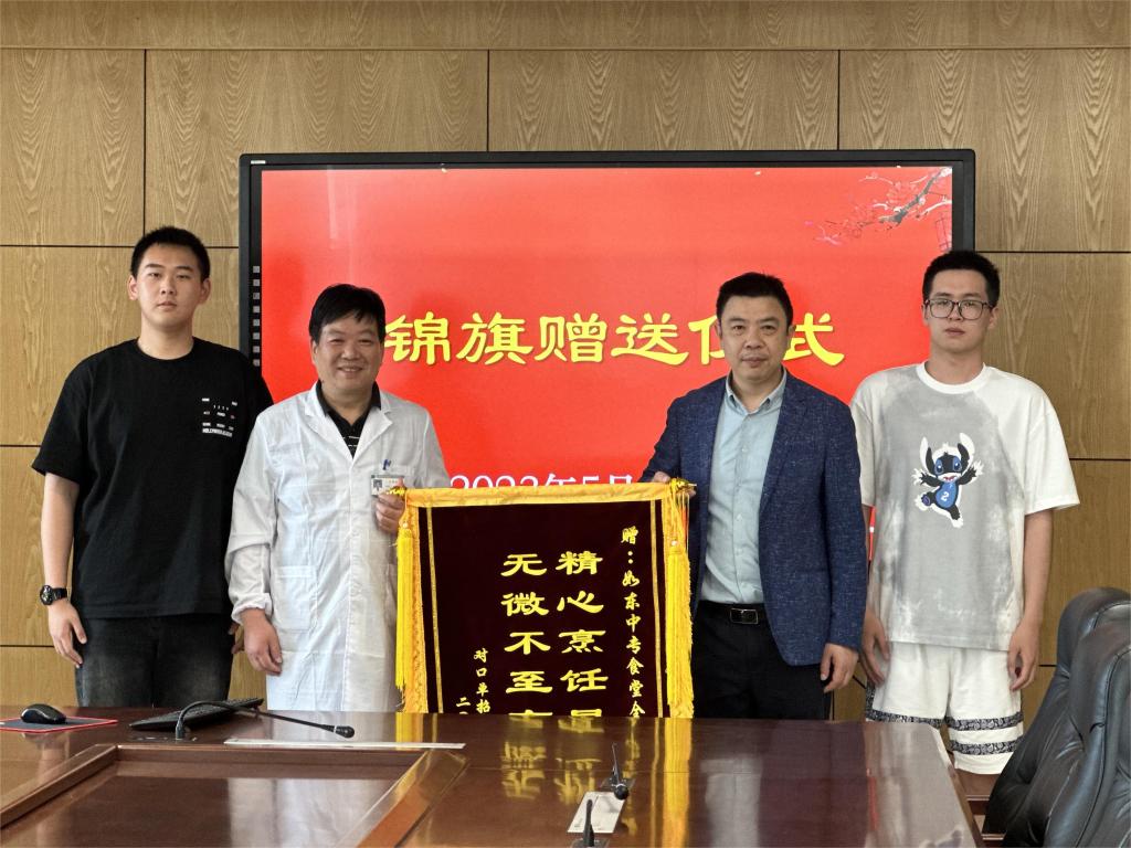 5月23日下午,对口单招部高三学生代表马陈、张雨晨在对口单招部主任花金明,高三年级主任唐小慧、年级组长葛福美的陪同下,为食堂送上将印有“精心烹饪显爱心 无微不至育桃李”的锦旗,衷心感谢食堂员工及总务后勤人员为学子提供的周到服务。