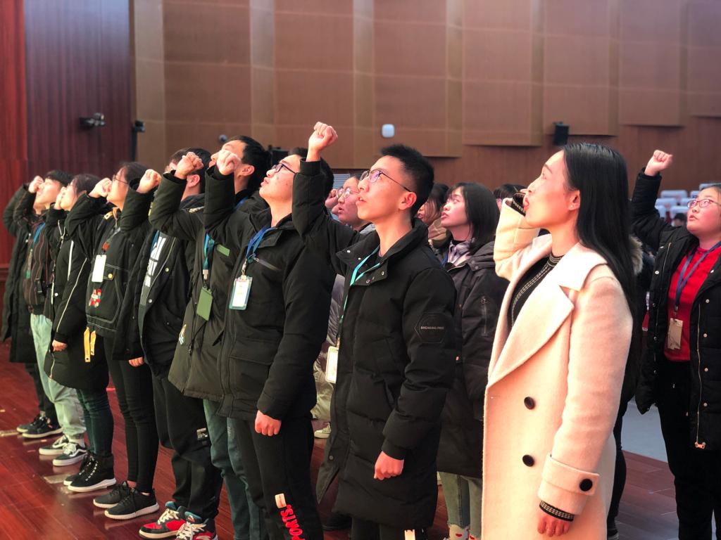 最后,全场同学起立,在年级组长唐小慧老师的带领下进行集体宣誓,发出了整个会议的最强音,将气氛推到高潮。