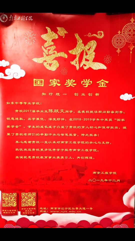 2020年1月8日,学校收到南京工程学院发来的喜报,喜报内容如下:江苏省如东中等专业学校,贵校2017届毕业生陈跃文同学,在南京工程学习期间勤奋刻苦、锐意进取、品学兼优、深受好评,在2018~2019学年度中荣获“国家奖学金”。学生的成长凸显了贵校的育人初心和使命担当,凝聚了贵校老师们的辛勤汗水与智慧能量。特此喜报。衷心感谢贵校一直以来对南京工程学院的关心与技能,热忱欢迎贵校更多优秀学子报考南京工程学院。