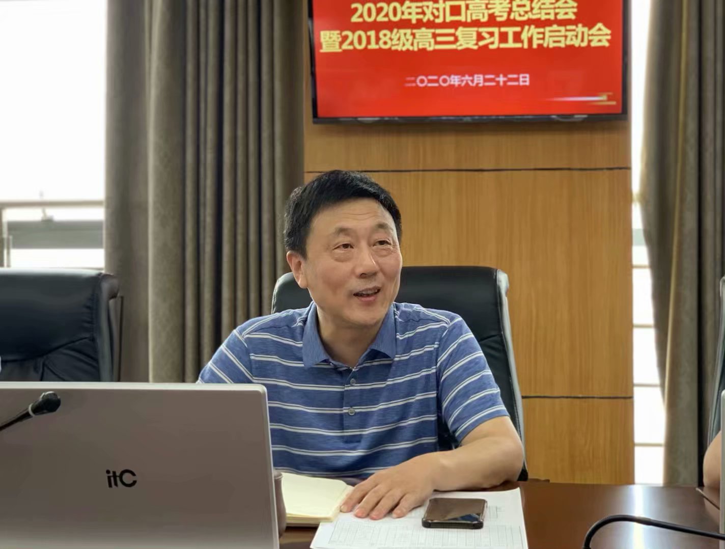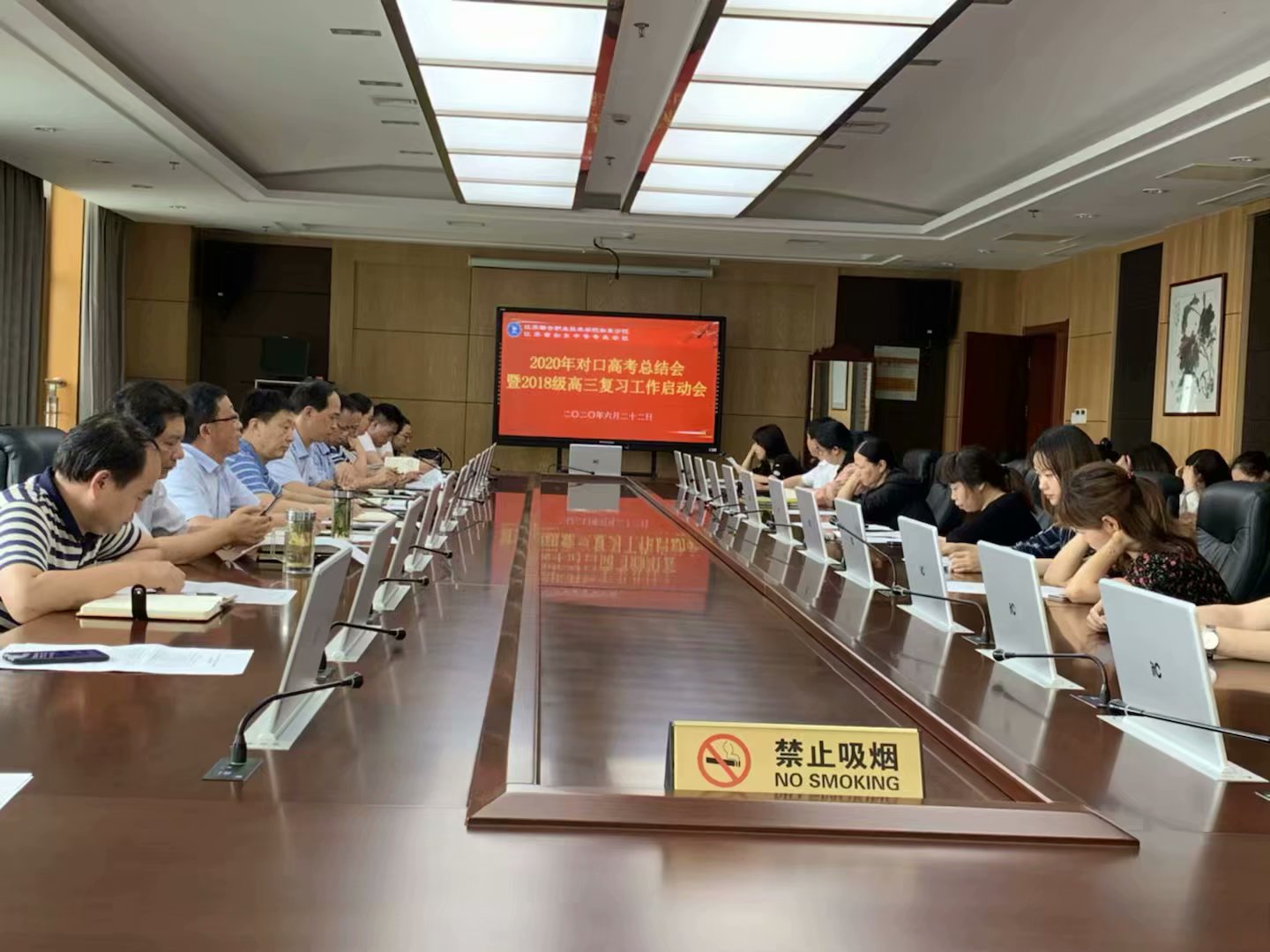 2020年6月22日下午,对口单招部高三全体教师在综合楼712会议室参加2020年对口高考总结会暨2018级高三复习工作启动会,参加会议的领导有余飞校长、曹峰副校长、孙智明副校长、陈建副校长,对口高中单招部花金明主任,陆建副主任,陆建荣副主任,宋丽华副主任,高三年级组组长于军老师。会议由曹校长主持,分为四个议程: