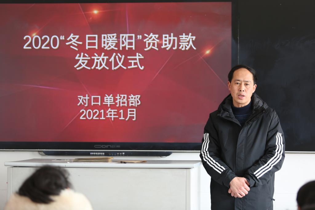 近日,如东县教体局、如东县教育工会发起了2020年“冬日暖阳行动”活动,1月26日对口单招部举行了资助款发放仪式。本次活动为本部15名困难学生提供了物质及精神帮助,分别为1名特困学生资助1200元,为14名困难学生资助600元。