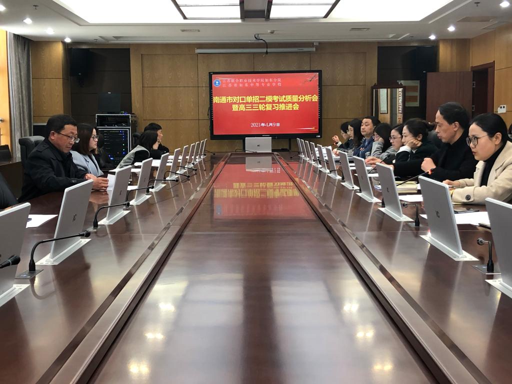 为更好地推进我校2021年对口高考工作,利于分析诊断、调整改进工作,指引复习重点工作方向,高效进行“考前半个月”复习,在高三二模考试成绩出炉之际,对口单招部于4月9日上午召开了南通市“二模”考试成绩分析会。教学副校长曹峰、对口单招部花金明主任,高三年级年级主任、年级组长及全体高三任课教师参加了会议。会议由高三年级年级主任宋丽华主持。