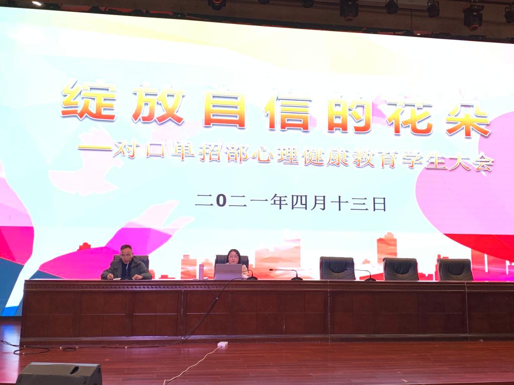 为进一步提高学生的心理素质,促进学生的身心健康和谐发展,宣传普及心理健康知识,4月13日下午,对口单招部高一高二年级全体学生在学校敬德堂参加了主题为“绽放自信的花朵”的心理健康教育学生大会。孙智明副校长出席大会,专业部主任、年级组长及全体正副班主任参加了本次大会。