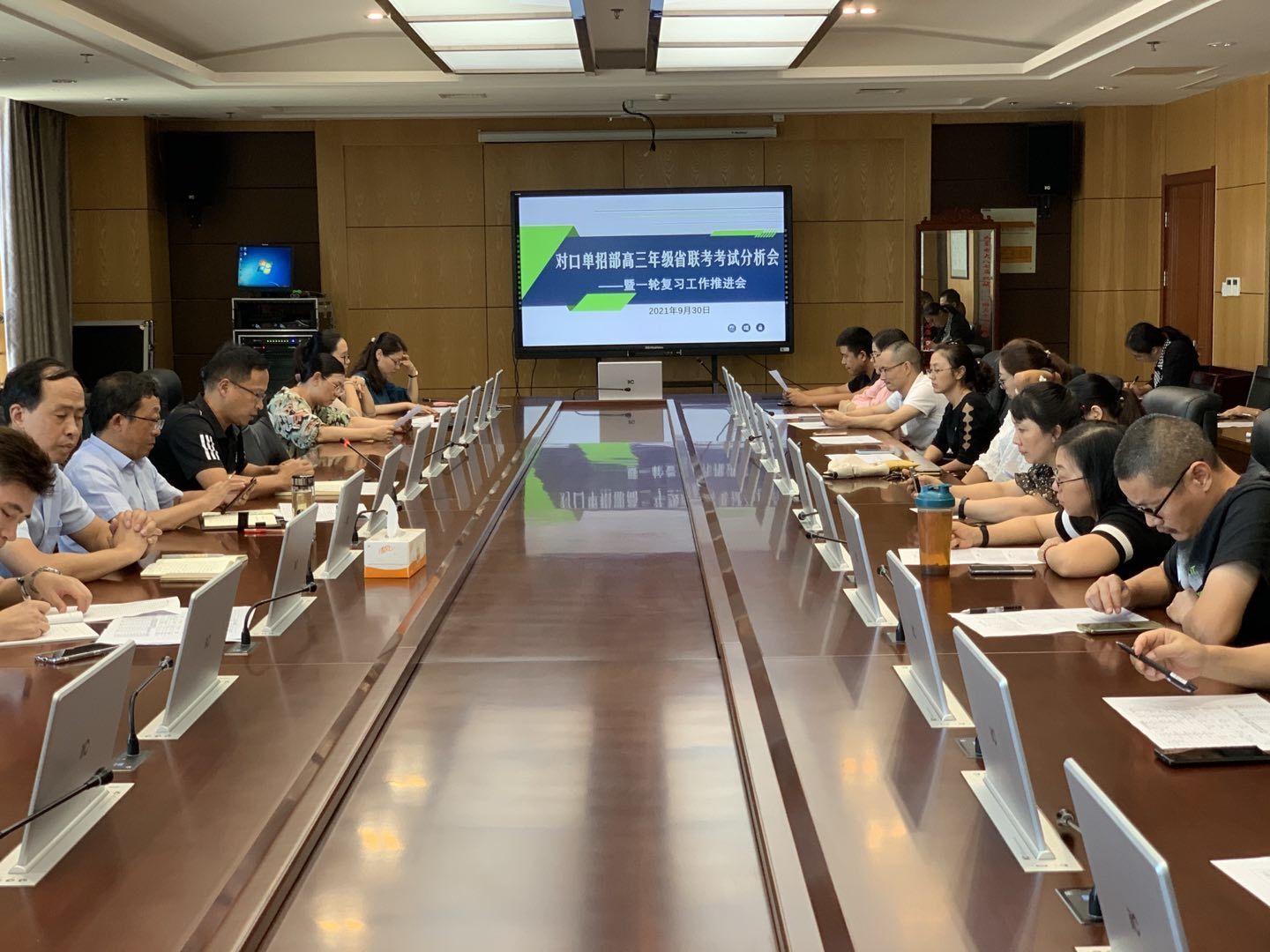 2021年9月30日下午2:00对口单招部在学校行政楼712会议室召开高三年级省联考考试分析会暨一轮复习工作推进会。曹峰副校长、对口单招部花金明主任、宋丽华副主任、高三年级主任陆建荣、高三年级组长赵志鹏老师及全体高三老师参加了会议。本次会议由陆建荣副主任主持,分为四个议程。