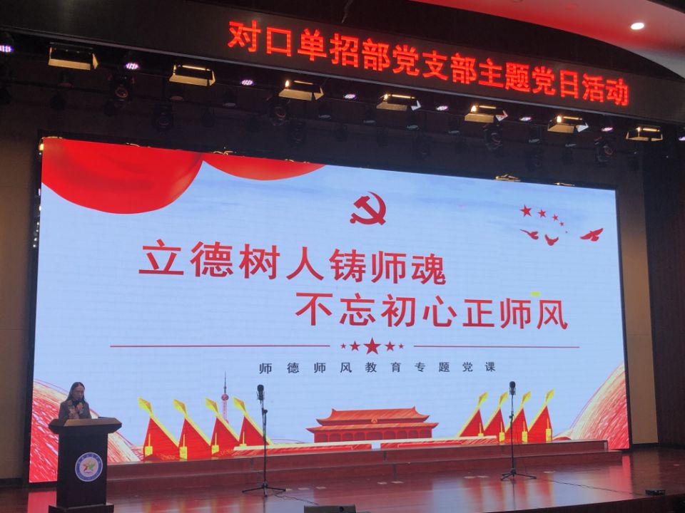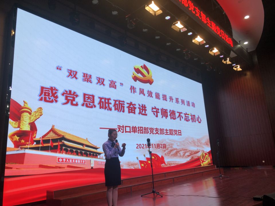 2021年11月2日,中共如东开放大学委员会对口单招部党支部在敬德堂开展了以“感党恩砥砺奋进守师德不忘初心”为主题的党日活动,活动共分为三个篇章。校党委余飞副书记,党委委员曹峰、孙智明、曹卫民、陈建、肖海兵、唐晓云,及学校全体党员参加了此次活动,此次活动由对口单招部青年党员郭瑾主持。
