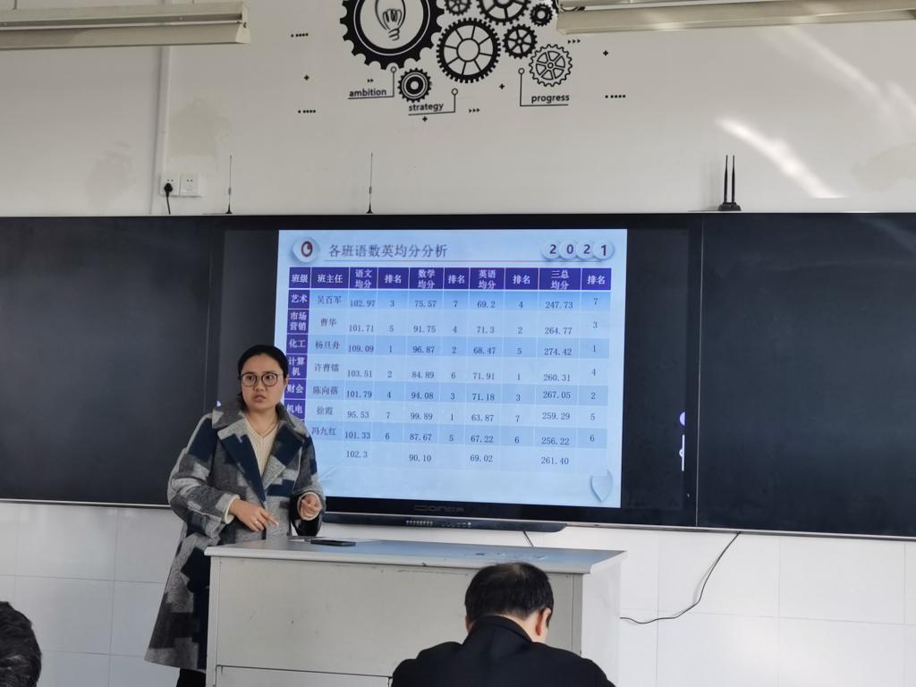 首先,宋丽华主任用清晰的表格、详实的数据对比分析了班级、学科和任课教师的成绩和目标达成情况,并与通州中专的期中考试成绩进行了对比,明确了本校学生的优势与劣势,进而明确了后期工作的重点。清晰的数字让每位任课老师做到了心中有数。