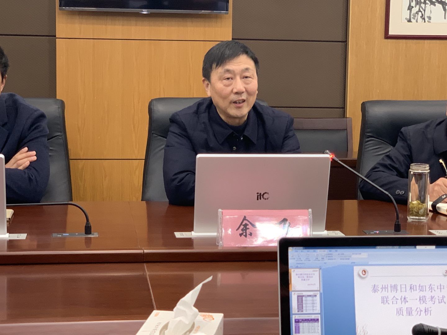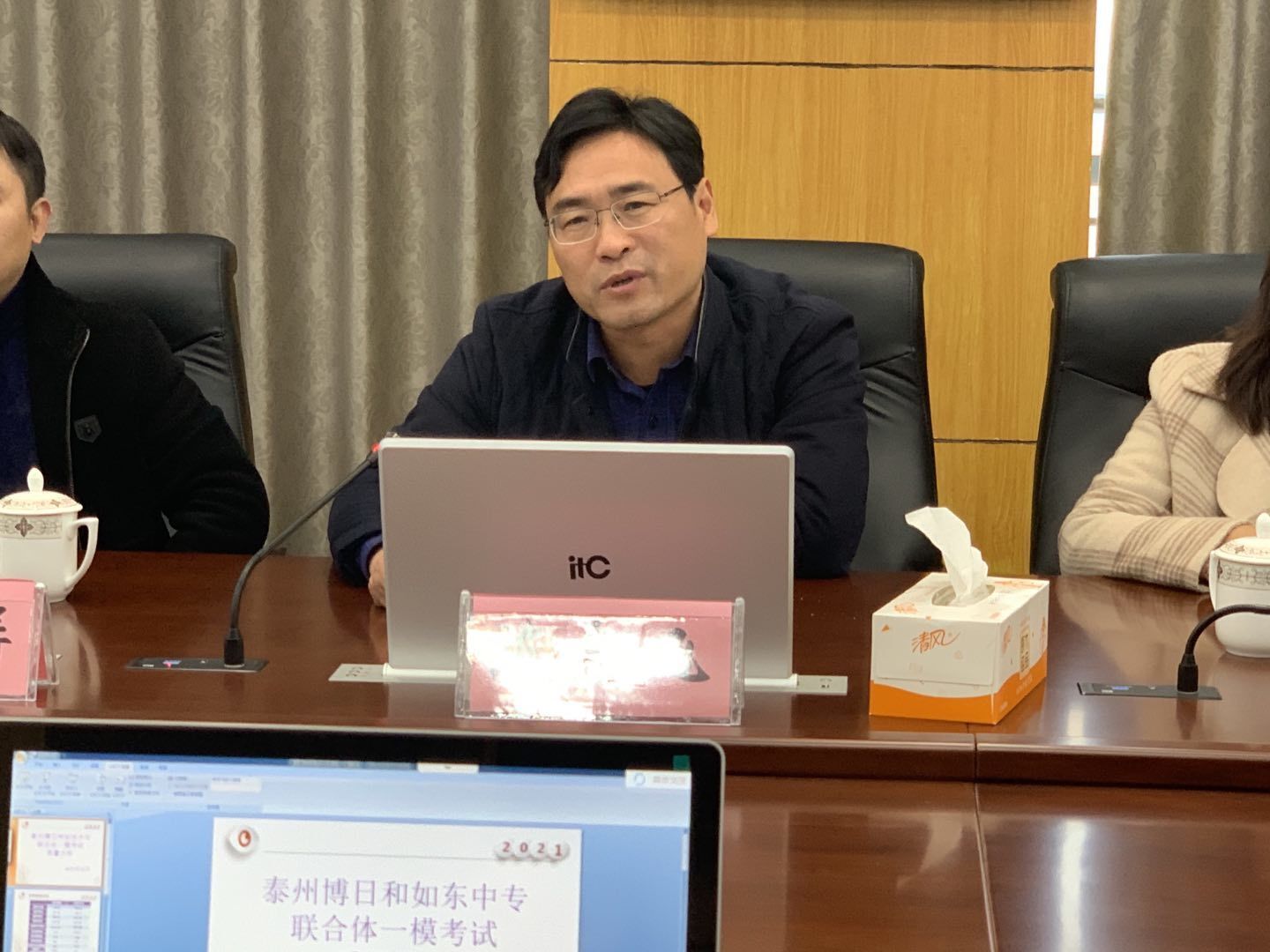 随后与会老师在学校会议室进行了交流学习,会议由曹峰副校长主持,曹峰首先代表学校对来参加考察活动的老师们表示欢迎,肯定了泰州市博日学校在对口计算机和艺术方面的办学成绩。接着由对口单招部宋丽华主任分析了本次两校省联合体一模的成绩,分别从均分和优分率等角度做了细致的分析,指出了存在的问题,明确了今后的努力方向,接着由陆建荣主任和陈校长分别交流了各自学校前期的做法,以及今后的举措,互相交流,取长补短。接下来余飞校长发言,他希望两校能互相交流,助力两校的对口单招教学的质量更加稳健,快速深入的发展,应予提倡和鼓励。会后,两校的四个科目组的老师就各自学科的复习进度、复习模式、方法策略等问题进行了深层次的交流。
