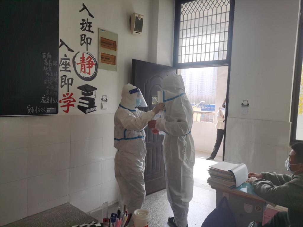 值班老师接到报告后,迅速做好自身防护(穿好防护服,戴上护目镜、口罩、手套等)及时赶到教室,将异常学生带至留观隔离室,详细询问、记录其近期出行轨迹,并确认该生有无近14天有中高风险地区旅居史。
