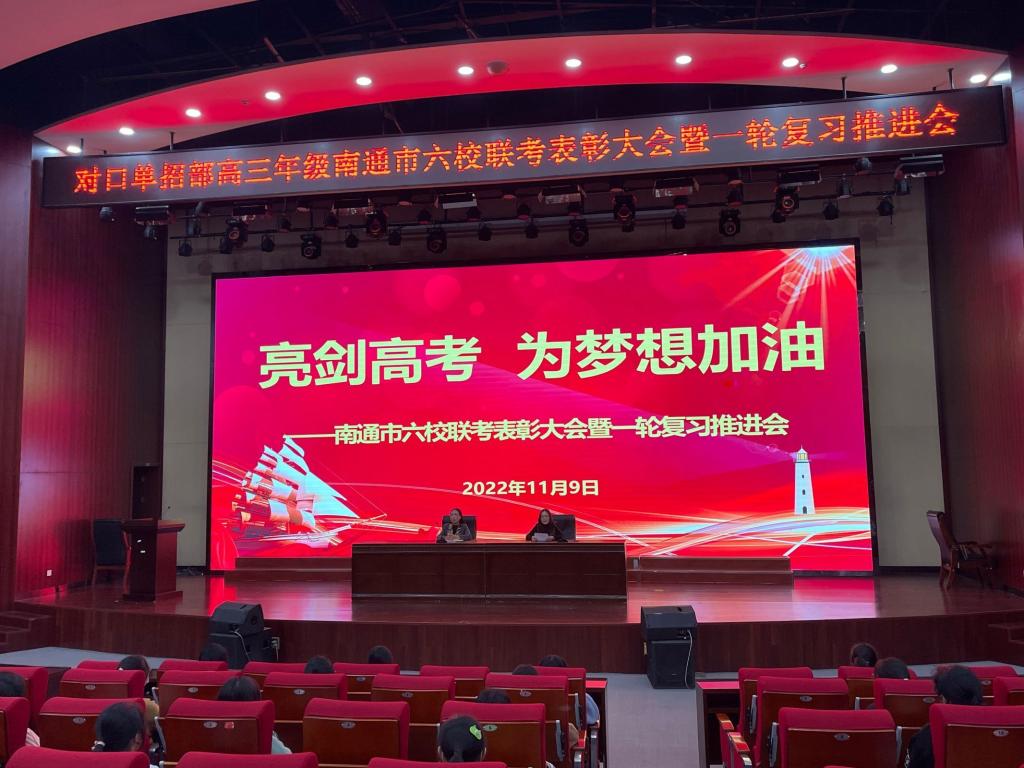 2022年11月9日中午,对口单招部在我校敬德堂召开了高三年级南通市六校联考表彰大会暨一轮复习推进会。会议由高三年级组组长葛福美老师主持,高三年级组主任唐小慧书记、全体高三学生和班主任参加。本次会议共有两项议程。