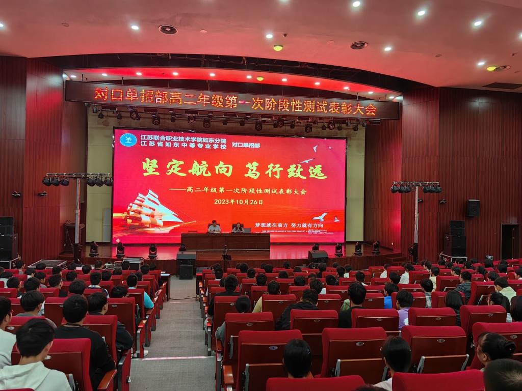2023年10月26日下午第三课,对口单招部在如东中专敬德堂召开高二年级学生表彰大会。专业部赵志鹏主任、葛福美组长、2022级全体学生及班主任参加会议。会议由葛福美组长主持。