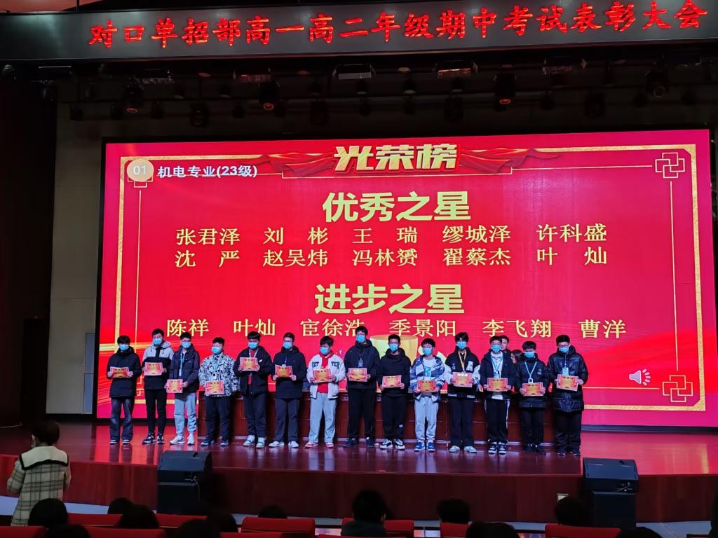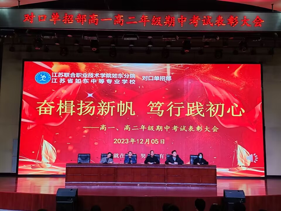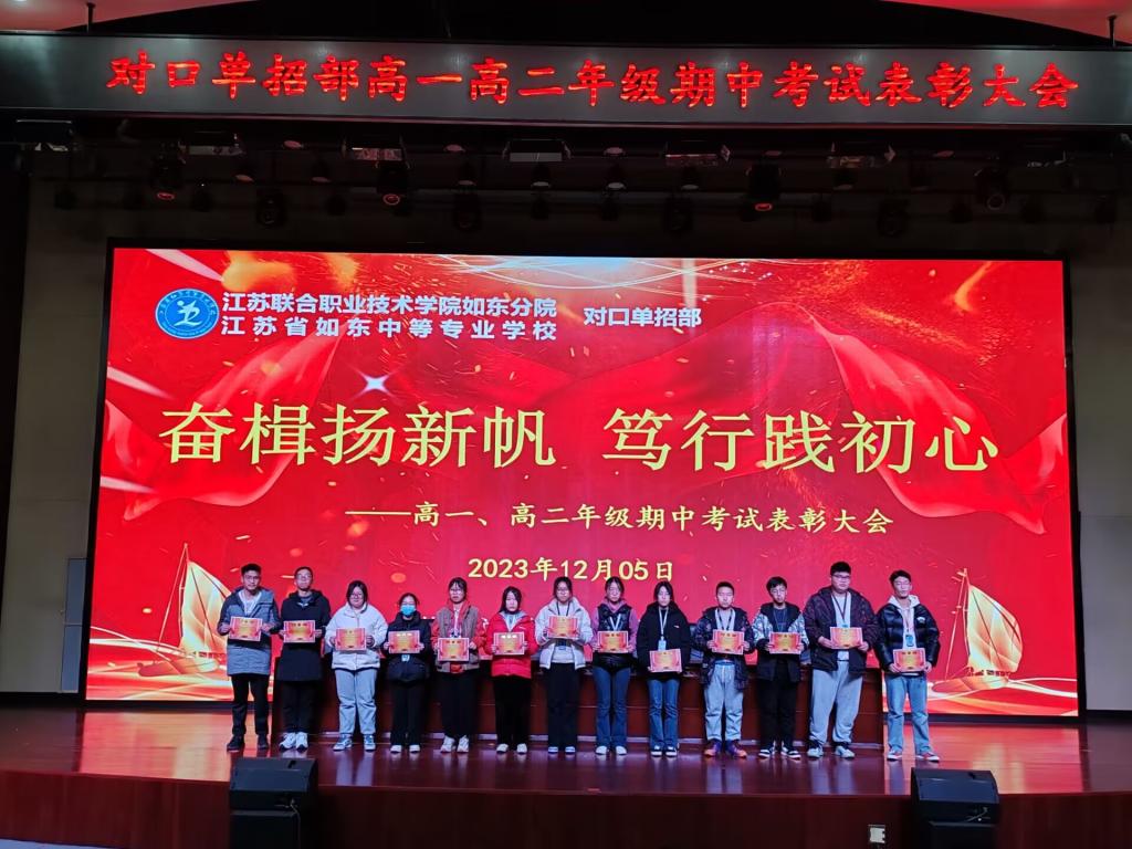 2023年12月5日下午第一、二课,对口单招部在如东中专敬德堂召开高一、高二年级学生表彰大会。专业部陆建荣主任、唐小慧书记、于军主任、赵志鹏主任、徐玮玮组长、葛福美组长、高一高二全体学生及班主任参加会议。会议由徐玮玮组长主持。